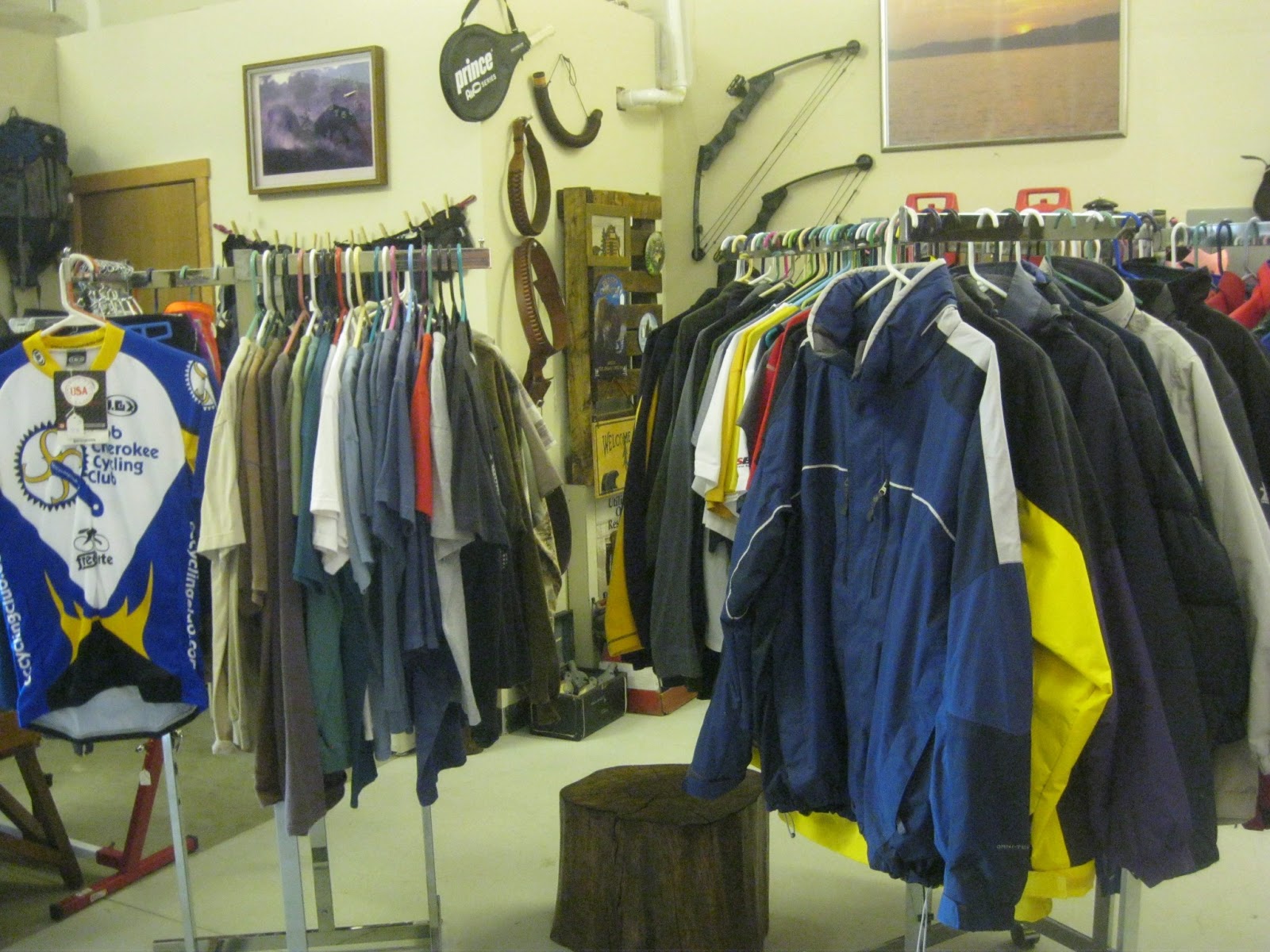 Sitting at my computer as I write this, I can see day and multi-day packs, fishing poles and reels, fishing nets, bicycle helmets, climbing harnesses, climbing helmets and shoes and gloves, a full face motor cross helmet, gun holsters, tennis rackets, bows, rifle scabbard, dove decoys, boots, more boots, a tent, camp chairs, scope, lanterns, camp cookware, black powder bag, gps holders, headlamps, sleeping bags, bicycle locks, water jugs, water bottles, small coolers, reflective vests, sun glasses, canvas saddle bags, tree climbing ropes, ice skates, youth snowboard helmets and one lonely snowboard, waders, snow shoes, roller blades, life jackets, swim fins, small canoe paddle and one very awesome kayak.
